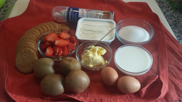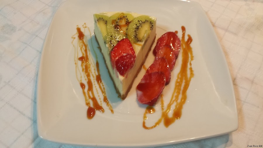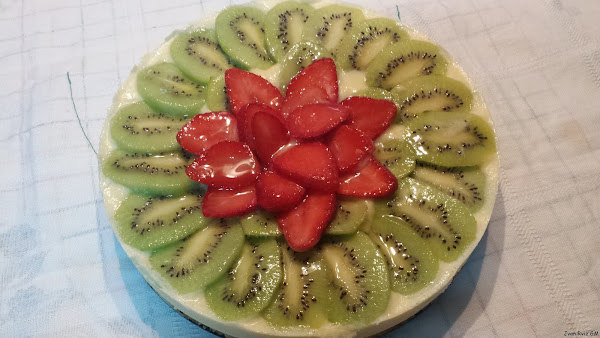 Una vez congelada, desamoldamos y decoramos con el kiwi y las fresas.