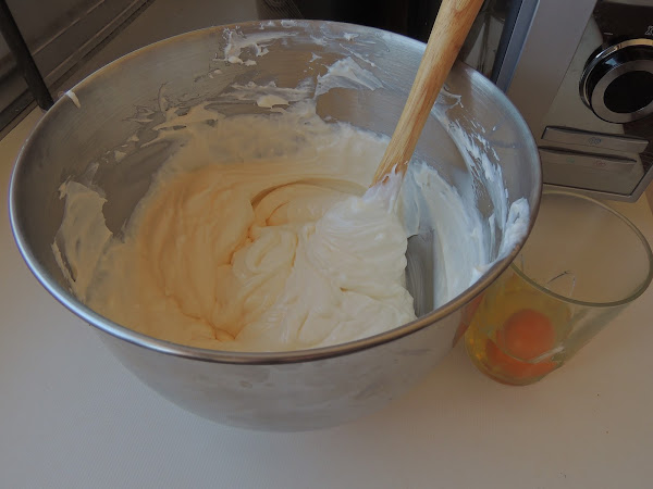 A continuación vamos añadiendo los huevos uno a uno. Es importante cascarlos en un recipiente aparte porque si uno estuviese en mal estado nos estropearía la tarta.