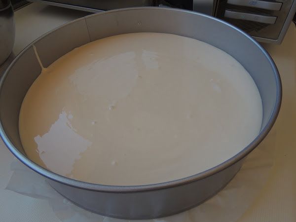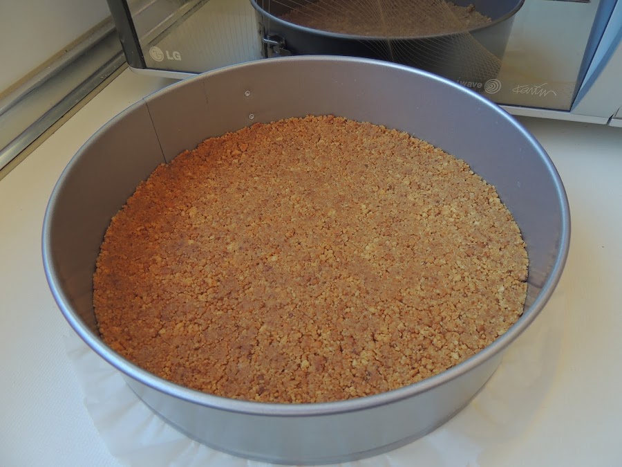 En un molde de unos 20-22cm de diámetro vertemos la masa de galletas y repartimos bien por toda la base. Dejamos en la nevera mientras preparamos el resto de la tarta y ponemos el horno a 180ºC para que vaya cogiendo temperatura.