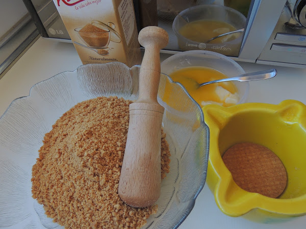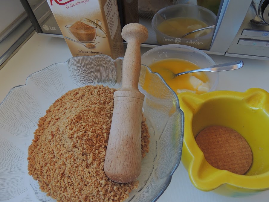Lo primero que haremos será preparar la base. Trituramos las galletas y les añadimos la mantequilla derretida y una cucharada de azúcar moreno. Mezclamos todo bien hasta formar una pasta consistente.