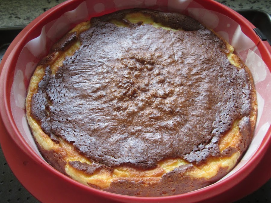 3- Bajar el horno a 200º, y hornear unos 50 a 60 minutos. Si véis que se dora mucho (Aunque esta tarta debe de quedar bien doradita), poner en los últimos minutos papel encima.Pinchar con aguja, si sale limpia ya está. Apagar el horno, entreabrir la puerta y dejar unos 15 minutos dentro. Sube mucho y después se baja, es normal.