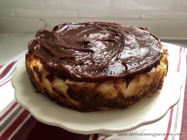Es súper fácil porque no hay más que mezclar todos los ingredientes y hornear. No lleva base de galleta y para hacerla como la original necesitamos forrar el molde con papel de horno humedecido con todas sus arruguitas. La he preparado al natural y también con una cobertura que tenía por casa. Está rica de todas las maneras pero sobre todo es que es muy rápida de hacer, ni base de galleta, ni baño María ni siquiera necesita cobertura.
