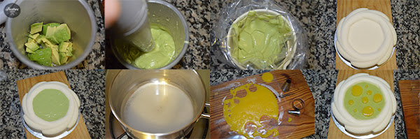 Para hacer el cremoso de aguacate, cogemos el aguacate y lo ponemos en el vaso de la batidora junto con el zumo de lima, el agua y el azúcar invertido. Le pasamos el túrmix hasta conseguir una mezcla homogénea. A continuación calentamos ligeramente la gelatina en el microondas hasta que se funda (previamente hidratada y bien escurrida) y se lo añadimos a la mezcla anterior. Metemos esta mezcla en una manga y rellenamos el hueco de la parte superior de la tarta. Ahora la guardamos en el congelador durante una hora aproximadamente.