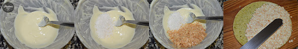 Una vez tengamos el financier frio, preparamos el crujiente, fundimos el chocolate blanco y lo mezclamos con el coco rallado y las neulas troceadas, vertemos sobre el financier y extendemos y alisamos con la espátula de modo que nos quede una fina capa (podemos calentar ligeramente la mezcla en el microondas para que nos sea más fácil extenderlo). Ahora lo metemos en la nevera para que se endurezca, unos 30 minutos aproximadamente.