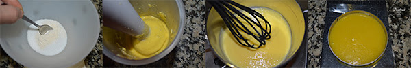 A continuación preparamos el gelificado, ponemos a calentar el puré de mango, en un bol aparte mezclamos el azúcar con la pectina, y lo vamos añadiendo poco a poco al puré de mango sin dejar de remover para que no se formen grumos, cuando empiece a hervir lo retiramos del fuego y muy rápidamente (aquí hay que ser rápidos porque en cuanto empieza a hervir comienza a espesar muy rápidamente) vertemos en un aro de 14 cm y lo congelamos.