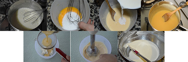 Pasamos la mezcla de nuevo al cazo y ponemos a calentar a fuego suave procurando que no pase de 84ºC (si pasara de 84ºC el huevo cuajaría) y sin dejar de remover hasta que empiece a espesar ligeramente. Retiramos del fuego, añadimos la gelatina (previamente hidratada en agua fría y bien escurrida) y removemos hasta que se disuelva. Colamos y dejamos enfriar a 60ºC, cuando este a esta temperatura añadimos el queso y le pasamos el túrmix hasta obtener una mezcla homogénea. Cuando la mezcla este a 30ºC, sacamos la nata (crema de leche) semimontada y añadimos una pequeña parte a la mezcla con ayuda de una lengua y realizando movimientos suaves y envolventes, a continuación añadimos el resto poco a poco y seguimos realizando movimientos envolventes hasta que se integre completamente en la mezcla.