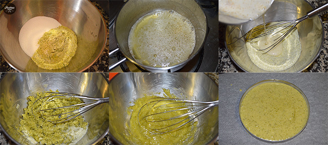 29 gr de harina, 22 gr de pistacho molido, 7 gr de almendra molida, 73 gr de azúcar, 1 gr de impulsor, 73 gr de claras, 44 gr de mantequilla, una pizca de sal.