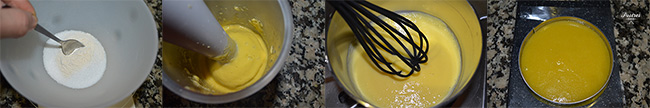 Ahora prepararemos la bavaroise, para ello primero semimontamos la nata (crema de leche) en un bol y la reservamos en la nevera. Ahora calentamos la leche en un cazo, en un bol aparte mezclamos las yemas y el azúcar, cuando la leche llegue a los 90ºC retiramos del fuego, incorporamos la leche a las yemas poco a poco para equilibrar la diferencia de temperatura y removemos.