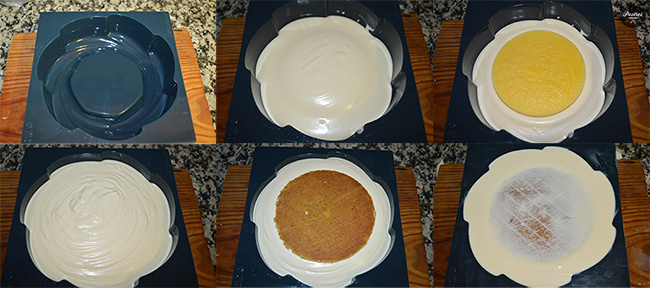 Debido al tipo de molde esta tarta la montaremos al revés, primero ponemos un la bavaroise en una manga y rellenamos una pequeña parte del molde, a continuación colocamos el gelificado de mango congelado justo en el centro, lo cubrimos con mas bavaroise pero sin llegar hasta arriba del todo, ahora colocamos el financier con la cara del crujiente mirando hacia abajo intentando que nos quede nivelado justo con la parte de arriba del molde ya que después habrá que darle la vuelta y esa será la base de la tarta, finalmente rellenamos por todo alrededor con más bavaroise y alisamos bien. Lo congelamos hasta el día siguiente.