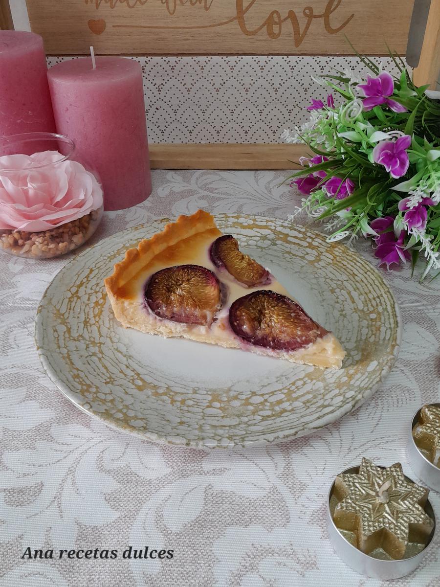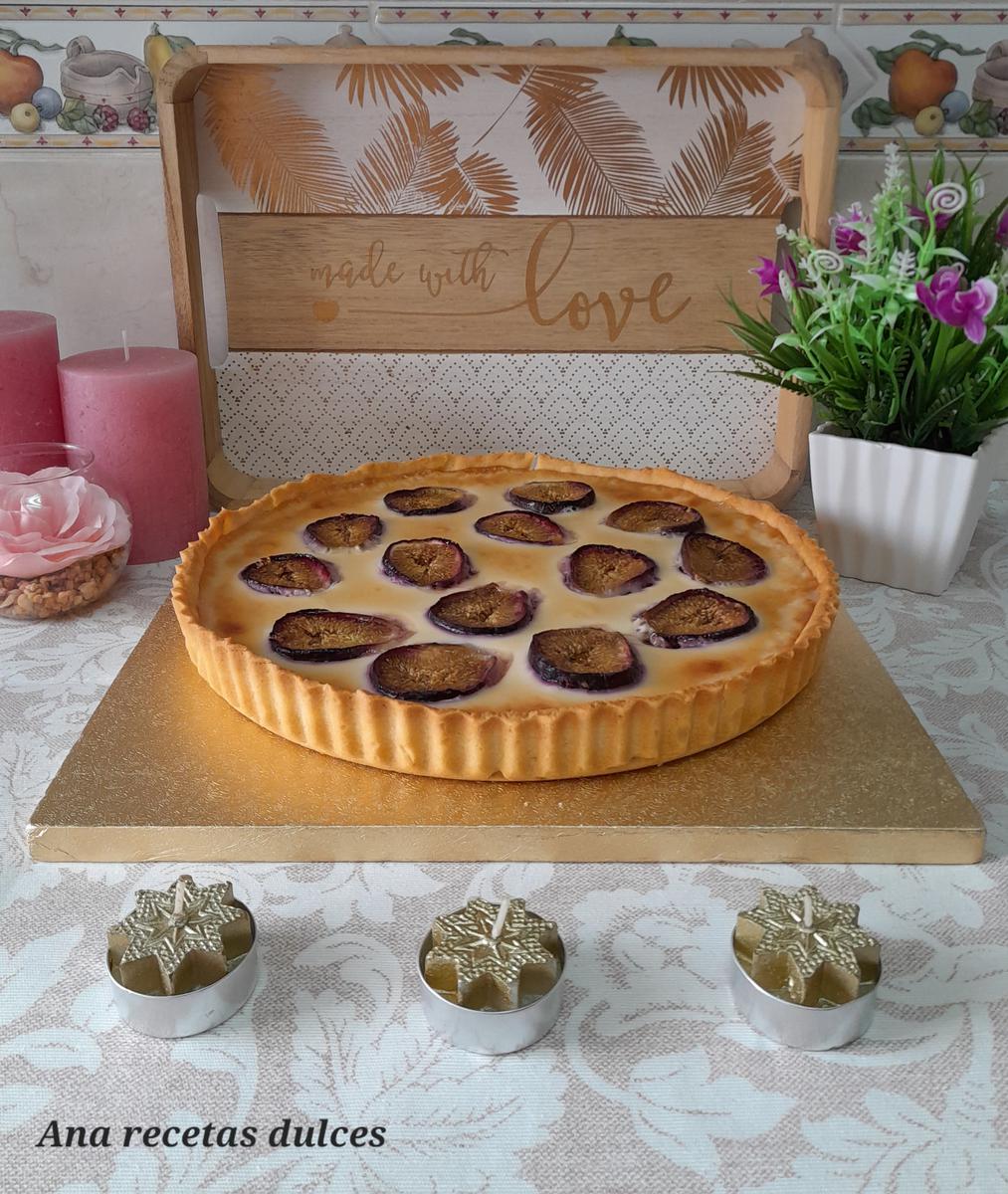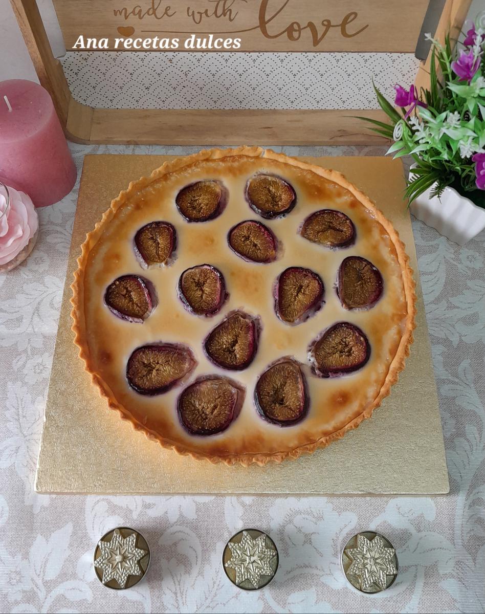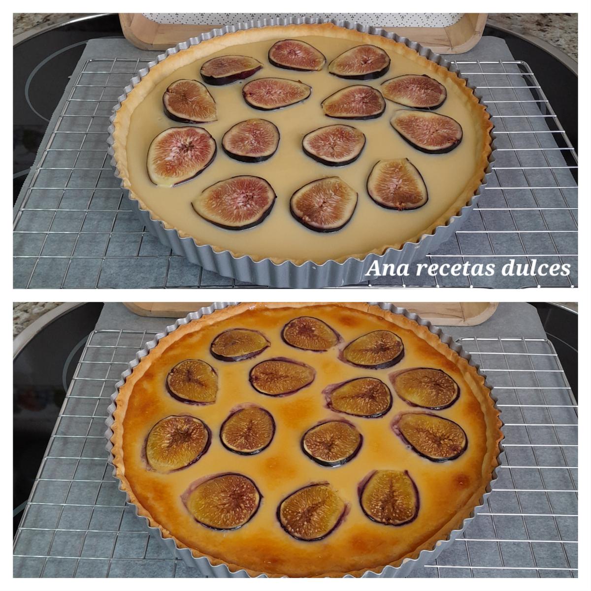 Vertemos en el molde sobre la base de masa quebrada y colocamos encima los higos cortados por la mitad con el lado cortado hacia arriba.