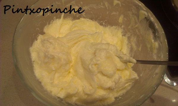 Deshacemos con una cuchara de silicona o madera los quesos yo en este caso lo he hecho con una cuchara normal y corriente, porque es más fuerte para batir el queso si no está a temperatura ambiente. Mi túnel carpiano no está últimamente para gracias.