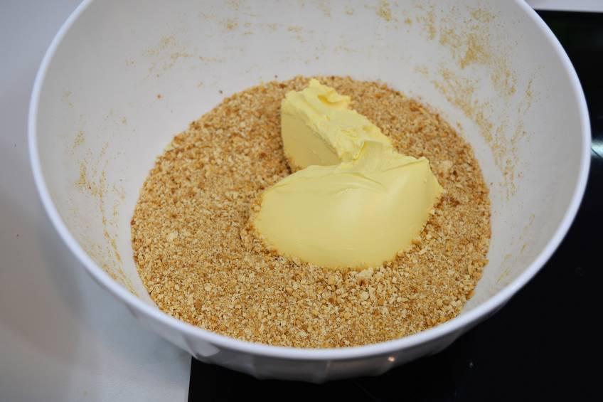 Paso 2 Comenzaremos a hacer la tarta de queso mascarpone preparando la base. Para ello tenemos que pulverizar unas galletas María y luego añadirles mantequilla en punto de pomada o directamente fundida.