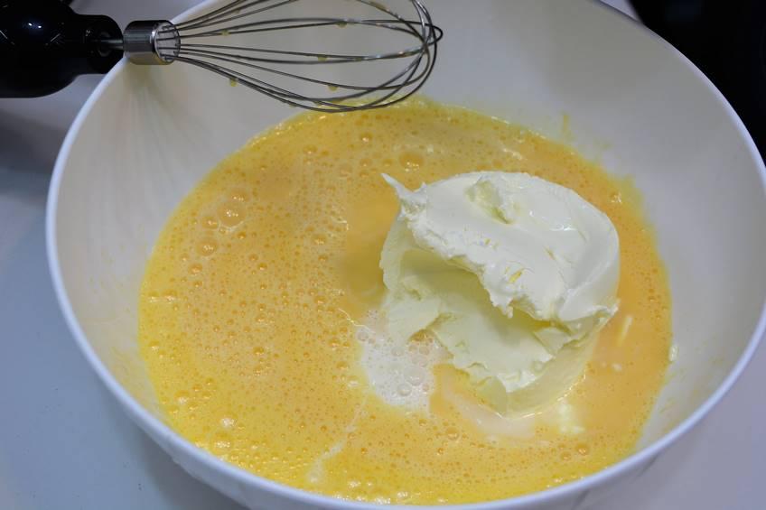Paso 5 Una vez mezclado todo, añadimos el queso mascarpone y los sobres de cuajada en polvo (o los 80 gr. de harina de maíz), y seguimos batiendo hasta que todos los ingredientes estén perfectamente integrados.