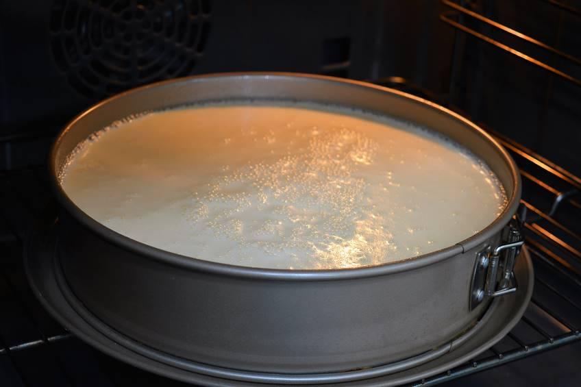 Paso 6 Ahora ponemos un poco de spray desmoldante en el lateral del molde y vertemos la mezcla líquida en su interior. Calentamos el horno a 160 grados centígrados con el calor arriba y abajo, y cuando haya alcanzado dicha temperatura metemos la tarta de queso mascarpone, que estará horneando durante 75 minutos aproximadamente, aunque eso siempre depende de los hornos claro.