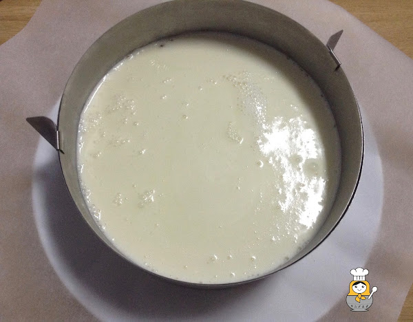 Calentamos a fuego medio hasta que esté a punto de hervir. Retiramos del fuego y vertemos encima de la capa de galleta.