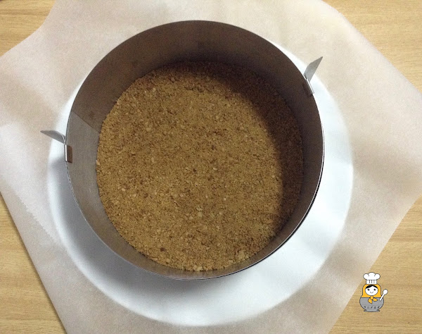 Este paso es un poco delicado ya que si echamos el líquido directamente sobre la galleta, seguramente cree un agujero en el punto en el que caiga y levante trocitos de galleta que se mezclarán con el queso.