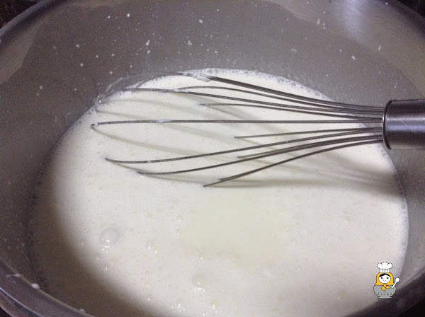 Por otro lado, en un cazo, diluimos el sobre de cuajada y el azúcar en la leche templada. Después añadimos la nata (crema de leche) y el mascarpone y batimos, muy atentos de que no nos queden grumos.