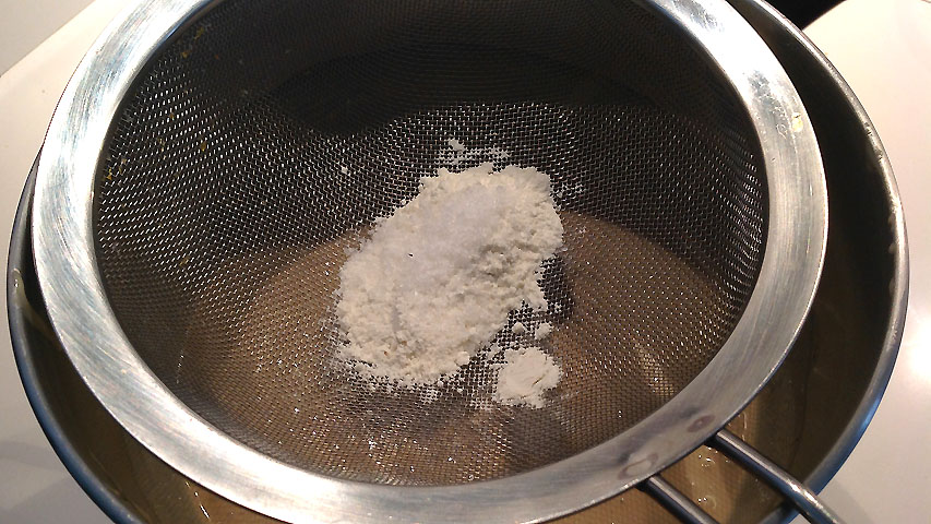 Tamiza la harina y la sal sobre la mezcla y vuelve a batir hasta mezclar muy bien.