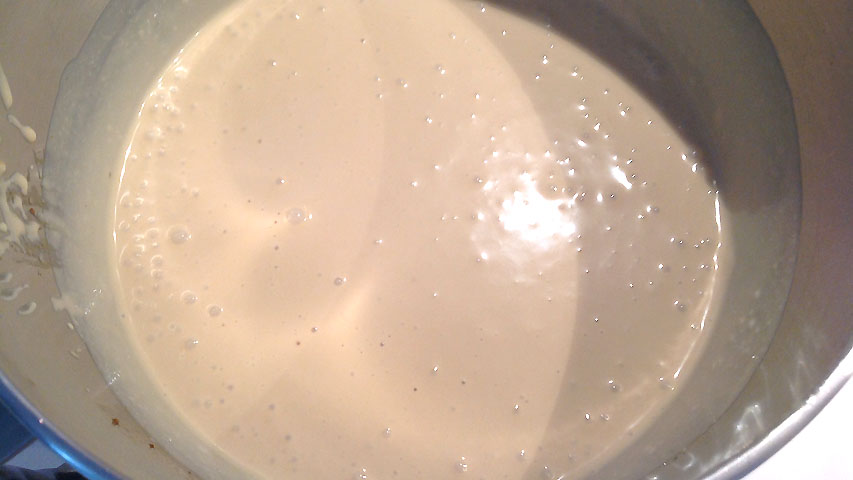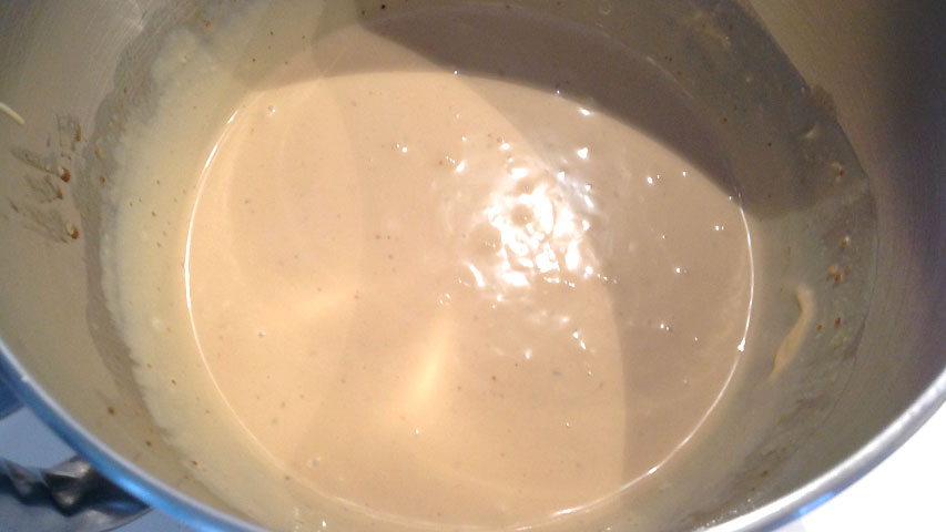 Tras añadir el queso... a cerrar otra vez. Debe quedar así de bien mezclado. Puedes usar una batidora eléctrica para ahorrarte trabajo.