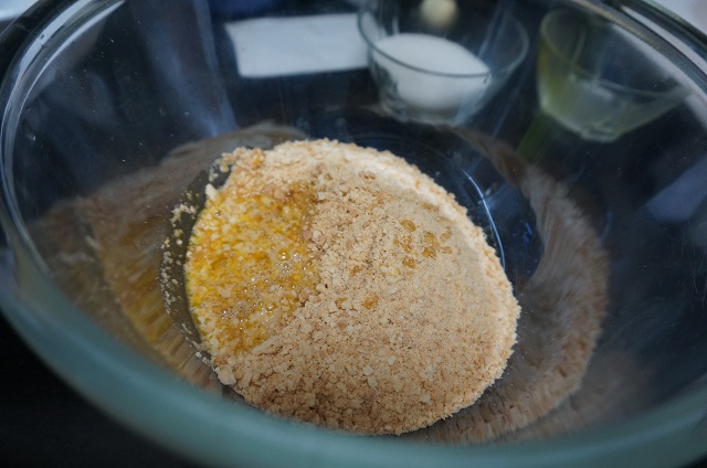 En un bol ponemos las galletas molidas y mezclamos con la mantequilla derretida.
