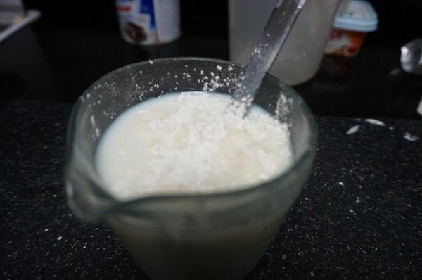 En un vaso ponemos los 200 ml. de leche y el sobre de cuajada, lo removeremos hasta que quede bien disuelto y no queden grumos de la cuajada.