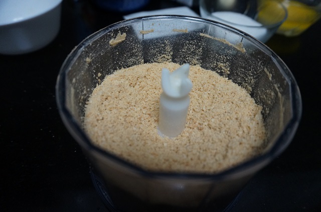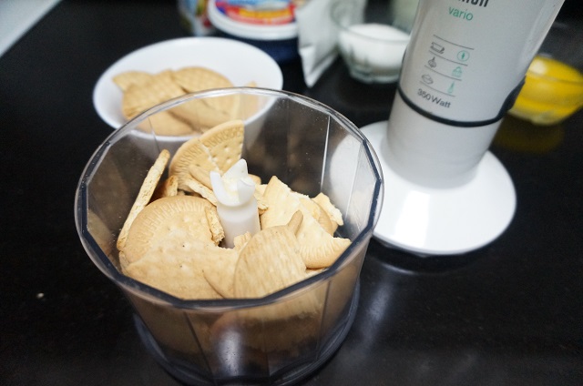 Empezamos triturando las galletas, lo podemos hacer con un robot o machacarlas con una botella o un rodillo.