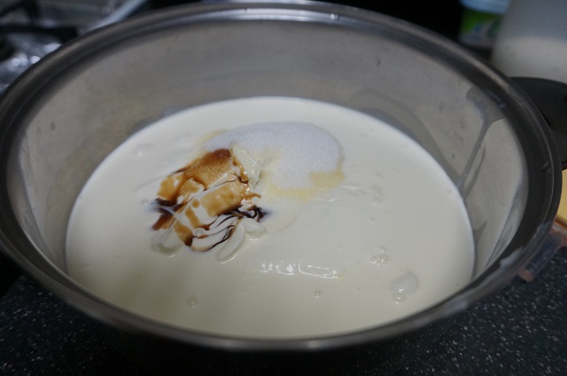 Mientras iremos preparando la crema. En un cazo ponemos la nata (crema de leche), el queso, la leche condensada, el azúcar y la esencia de vainilla, lo ponemos a calentar a fuego medio e iremos removiendo.