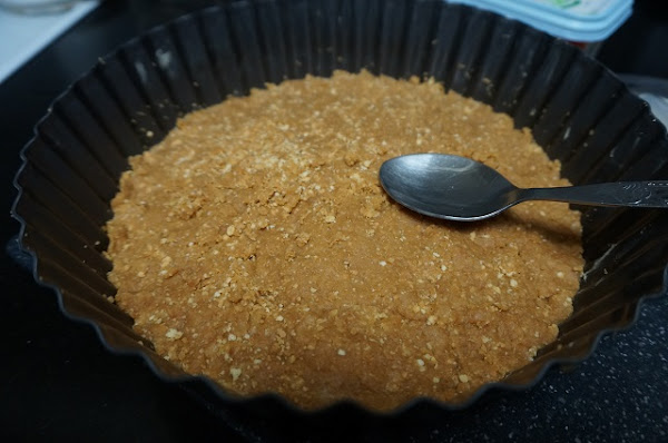 Iremos poniendo galletas formando la base de la tarta y con la ayuda de una cuchara o un baso, apretamos para que quede bien firme la base. Lo meteremos en la nevera.