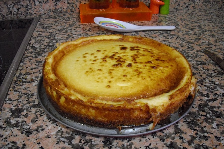 Después batimos bien con la batidora los demás ingredientes (huevos, leche, nata (crema de leche), azúcar, ralladura de limón y maizena) hasta que se quede sin grumos. Lo echamos por encima de la base de galletas y se mete al horno a 180º unos 30-40 minutos. Volvemos a usar el truco de cuchillo-palillo: si pinchamos y el cuchillo sale limpio es que ya está.