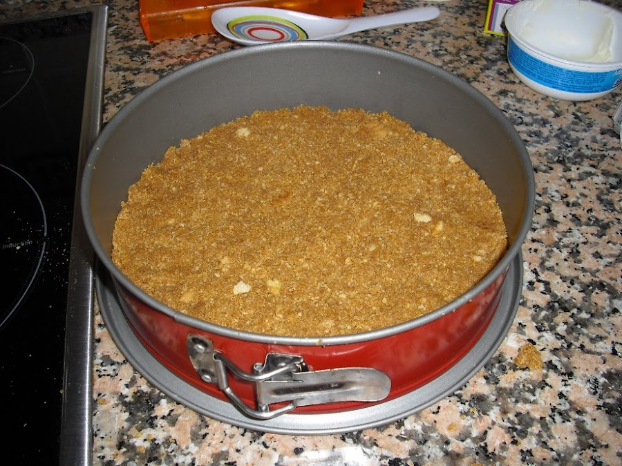 esta pasta en la bas e de un molde desmoldable (ojo con éstos, si se deforman por el calor, puede salirse después la masa). Apretamos bien las galletas para que se quede el fondo, y mientras preparamos la tarta, metemos la base al congelador.
