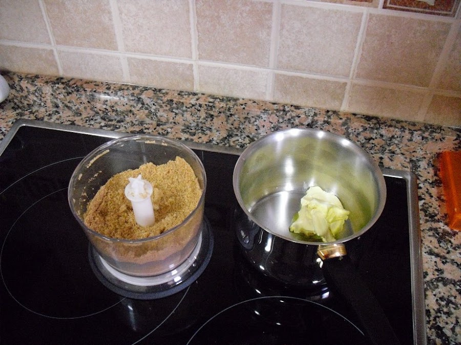Empezamos haciendo la base: derretimos la mantequilla o margarina en un cazo a fuego muy lento, mientras trituramos el paquete de galletas, yo lo hago con la picadora para no tirarme tanto rato con el mortero.