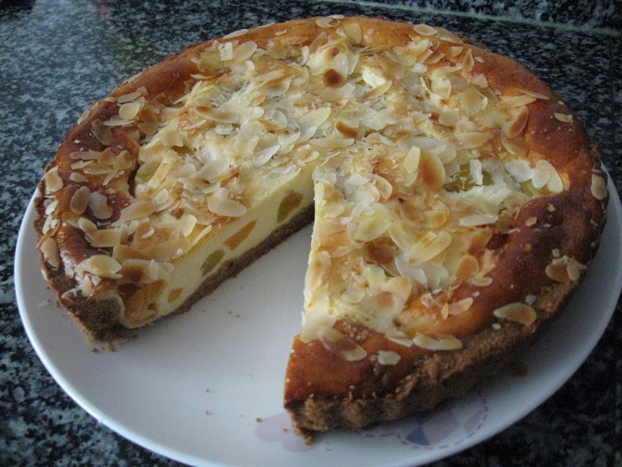 Vertemos la crema de queso encima de la base que habíamos reservado y colocamos encima el melocotón que habremos previamente cortado en trocitos o en gajos. Metemos en el horno y lo dejamos unos 30 minutos.