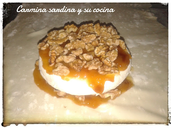 En el medio del cuadrado comenzamos poniendo una capa generosa de mermelada, seguido otra capa de nueces también generosa, poner el queso encima