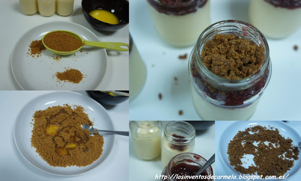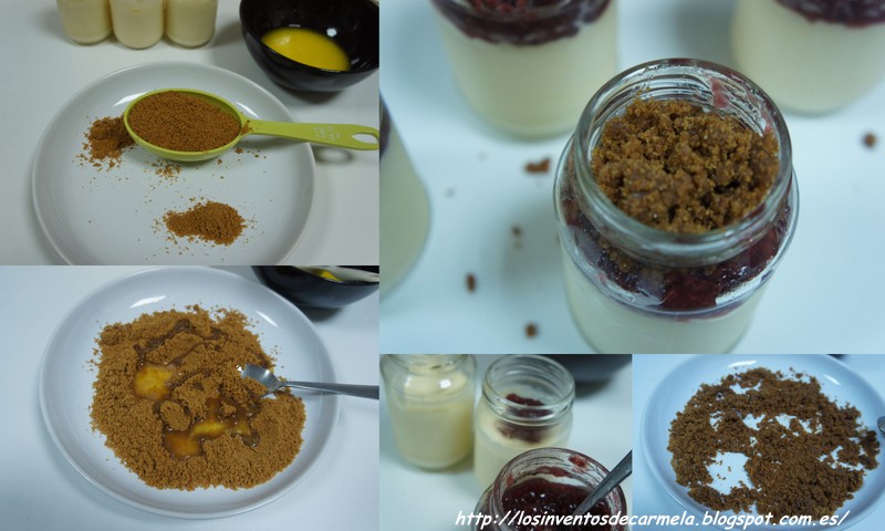 5) Poner en cada tarrito un poco de mermelada y a continuación, las migas de galleta preparadas.
