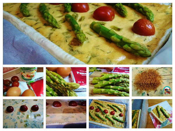 3.- Cubrimos una tartera rectangular con papel de horno para cocinar. Estiramos la lamina de hojaldre sobre el papel de horno, cubriendo el molde por dentro. En un bol mezclamos la nata (crema de leche) con los huevos, la maicena, el queso, la sal, la pimienta y la nuez moscada. Cortamos los tallos de los espárragos en trozos pequeños y los incorporamos con la mezcla. Reservamos las puntas para decorar. Vertemos la mezcla sobre la masa de hojaldre. Lavamos los tomates cherry y secamos con papel de cocinar. Colocamos los tomates en fila, haciendo una linea en el medio. Cocinamos la tarta 35 o 40 minutos a 180º C con el horno precalentado. Dejamos templar unos minutos y servimos con la puntas de espárragos.
