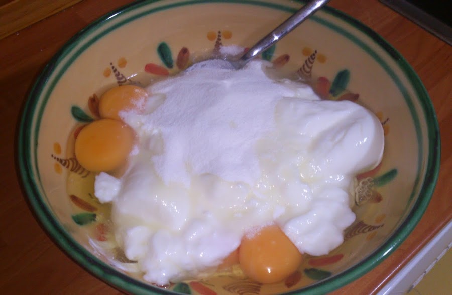En un cuenco mediano vamos añadiendo los ingredientes sin orden expreso y sin batir antes ni nada.