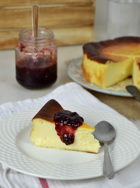 Esta tarta de queso se toma por lo general sola porque tiene mucho sabor y es bastante dulce. Si quieres luego acompañarla de mermelada o sirope te aconsejo que bajes unos 60-80gr de azúcar de la receta original.