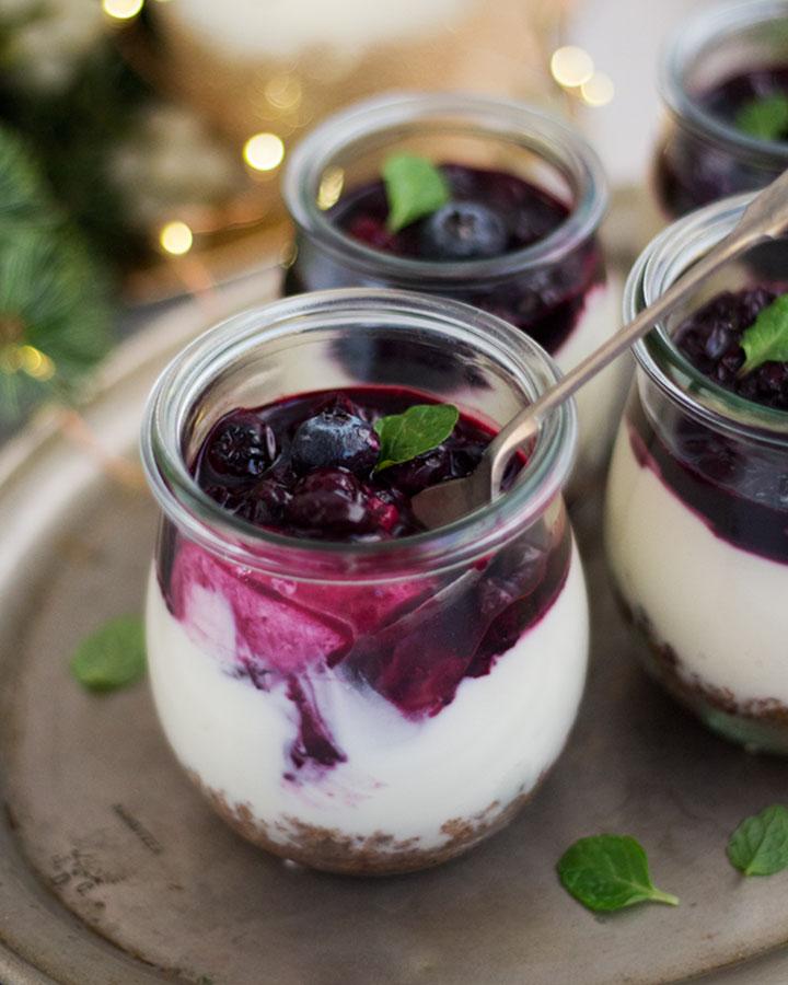 Reserva en la nevera hasta el momento de servir. Decora cada vaso con unas hojas de menta y un arándano en el medio. ¡Listas para disfrutar!