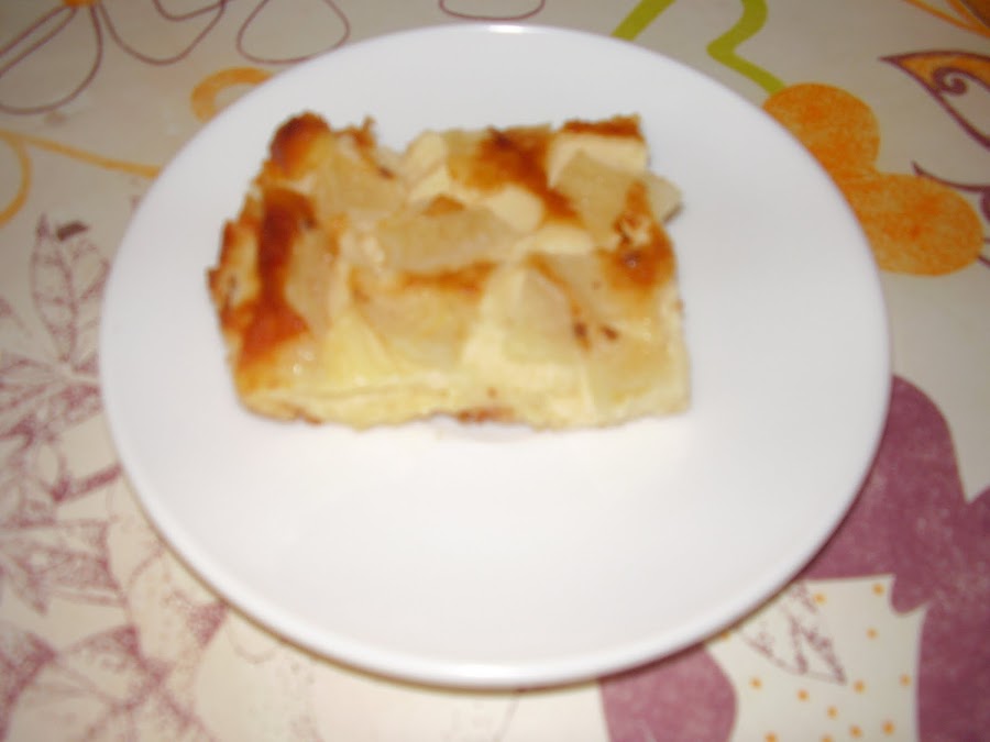 azúcar, el anís (un poquito), y lo volcamos en una fuente de cristal. Añadimos entonces la pera cortada a trocitos.