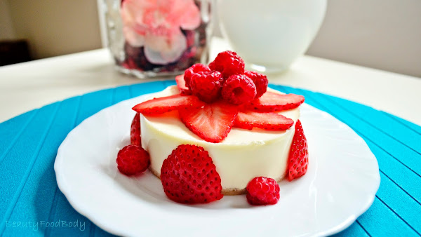 Desmoldar y decorar. Para reducir calorías y daros otra opción he sustituido la mermelada por fruta. No es necesario usar ambos quesos, podéis usar sólo el queso de untar 0% casero pero entonces tendrá menos sabor a queso.