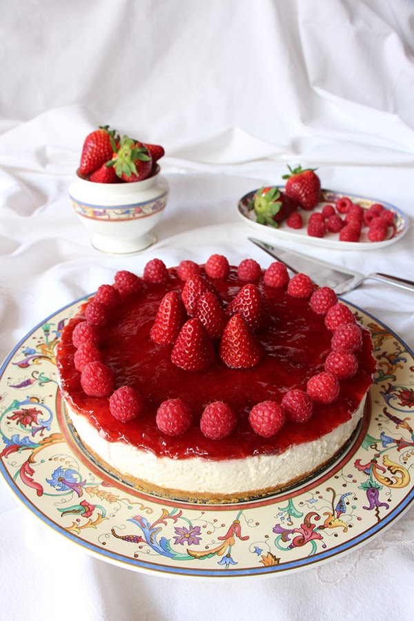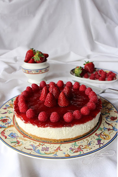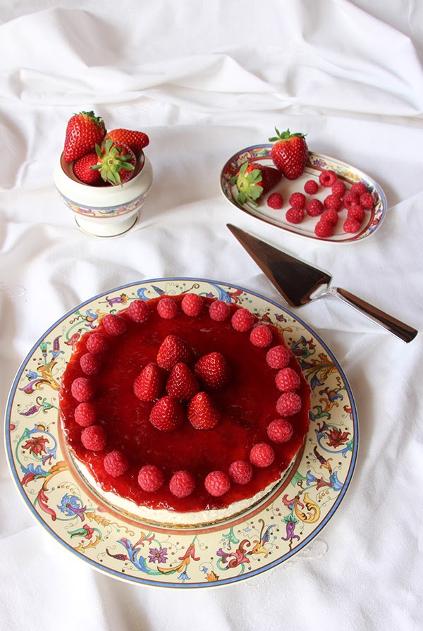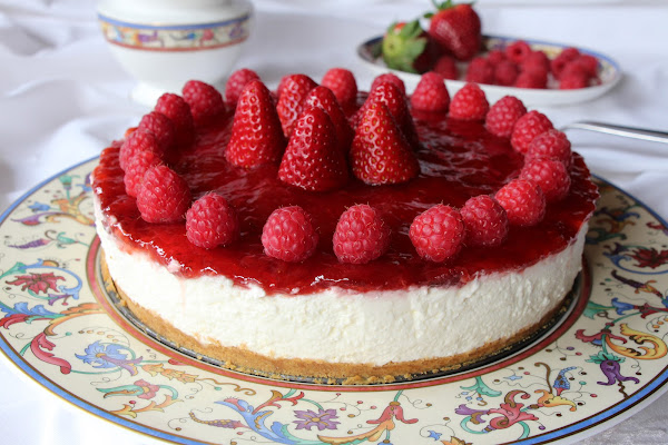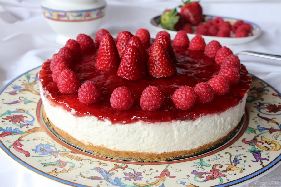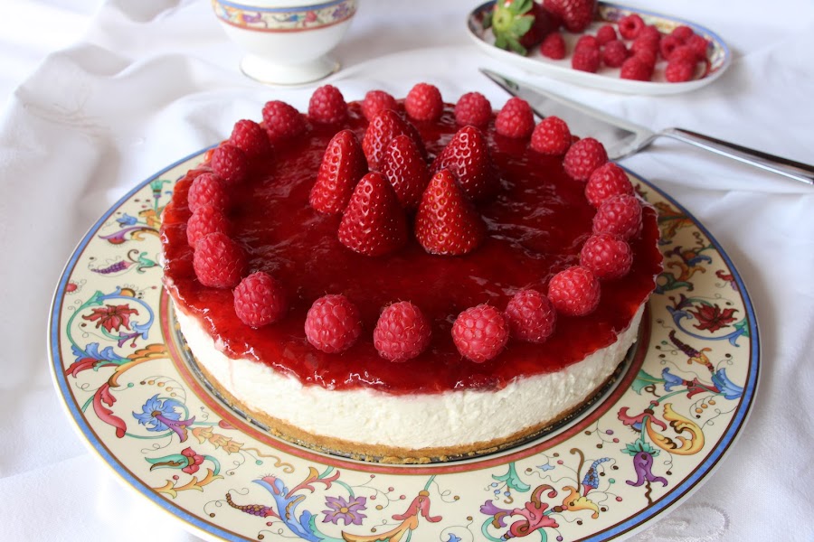 Sólo faltará desmoldarla, acabar de decorar la tarta con las fresas y frambuesas, y ya estará lista para degustar