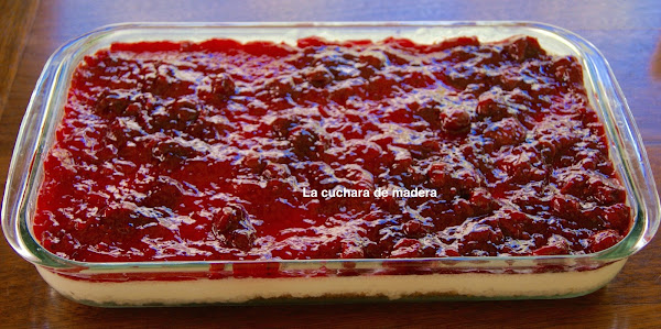 Cuando ya está cuajada y fría, ponemos encima la mermelada de fresa cubriendo toda la tarta; como ves en la foto, la mermelada tenía bastantes trozos de fresa.