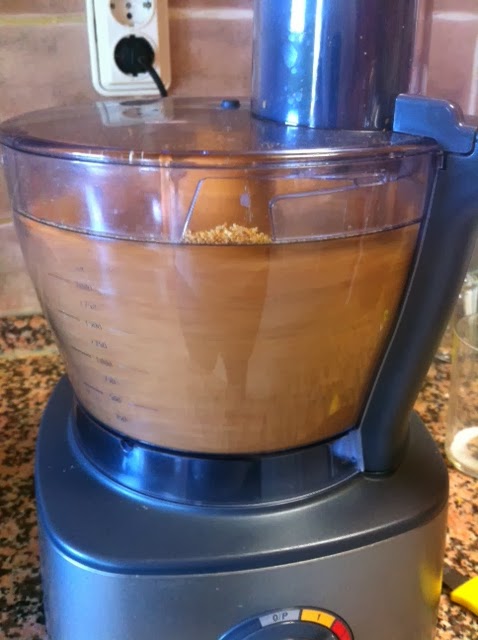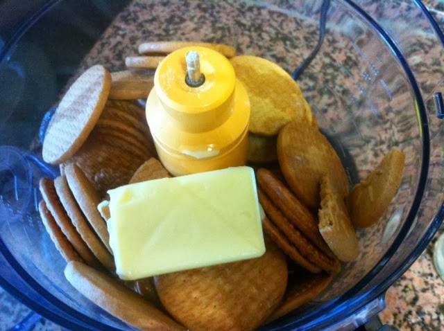 Mientras triturar las galletas junto con la mantequilla y la canela (opcional). La mantequilla tiene que estar blanda. Si la sacáis del frigorífico meterla 20 segundos al microondas para ablandarla.