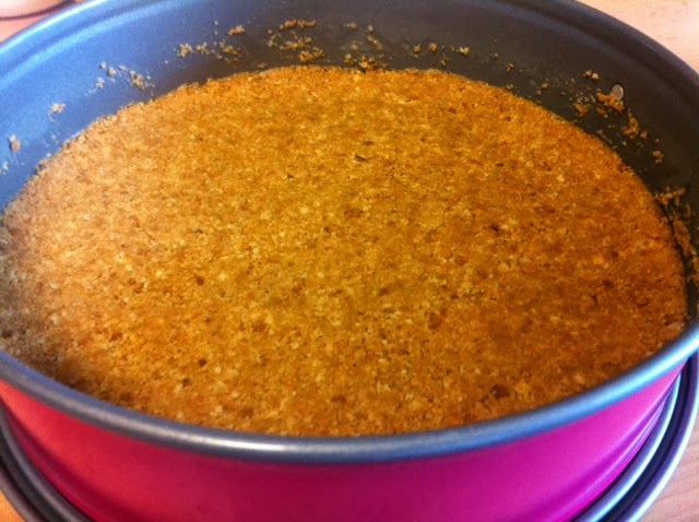 Coger el molde para la tarta, que tiene que tener la base desmontable y cubrir el fondo con una capa de la mezcla de la galleta y la mantequilla, presionando bien con una cuchara. Os tiene que quedar una base de 1 cm aproximadamente. Reservar.