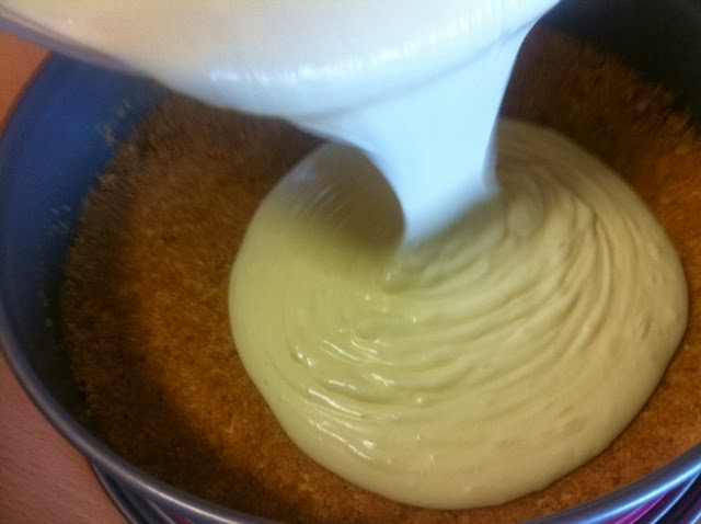 Una vez batida la mezcla, vertemos encima de la base de galleta, tapamos con film y metemos al frigorífico unas 5 horas.