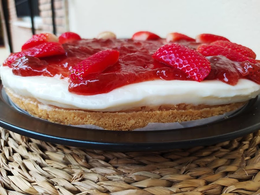 Antes de comer le añadimos por encima mermelada de fresas y fresas troceadas, queda deliciosa, tiene una textura cremosa, no queda compacta.
