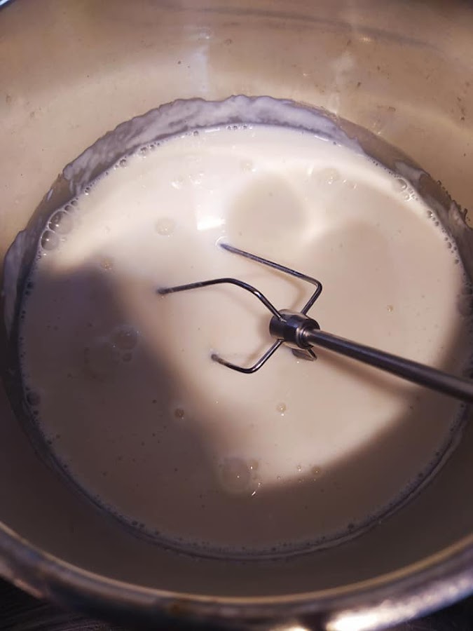 Mezclamos a fuego medio hasta que se integren todos los ingredientes, cuando ya no queden grumos añadimos los dos sobres de cuajada y volvemos a mezclar, dejamos un par de minutos en el fuego.