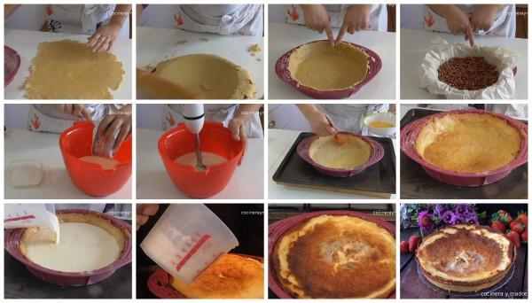 Lo primero que tenemos que hacer es hornear la masa quebrada que será la base de nuestra tarta de queso tradicional. Para ello encendemos el horno a 180ºC con calor arriba y abajo y sin aire, además estiramos la masa con la ayuda de un rodillo.