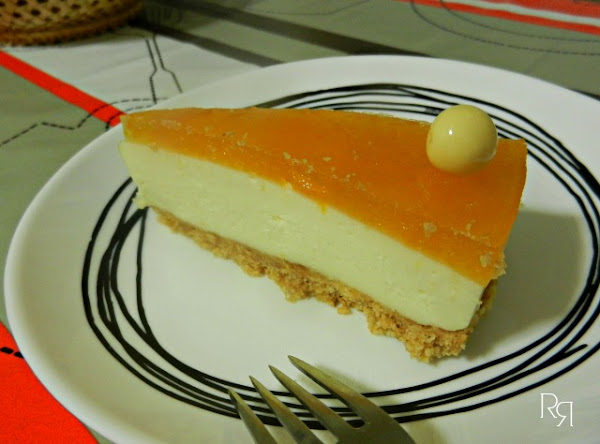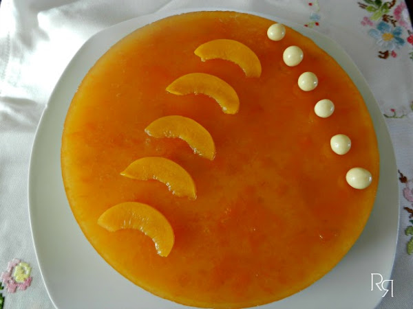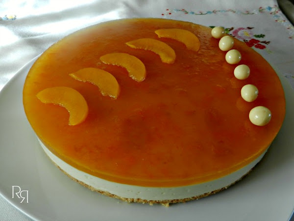 Esta tarta de queso y chocolate blanco sin horno es muy sencilla aunque requiere cierta espera para dar tiempo a que cuaje la crema primero y luego la gelatina: yo lo que hago es preparar la base y la crema por la tarde y la dejo en la nevera, al día siguiente por la mañana hago la gelatina y así está lista para la hora de la comida. La puedes adornar con lo que quieras, como mas te guste, yo le he puesto unos gajos de melocotón en almibar y unas bolitas de chocolate blanco.