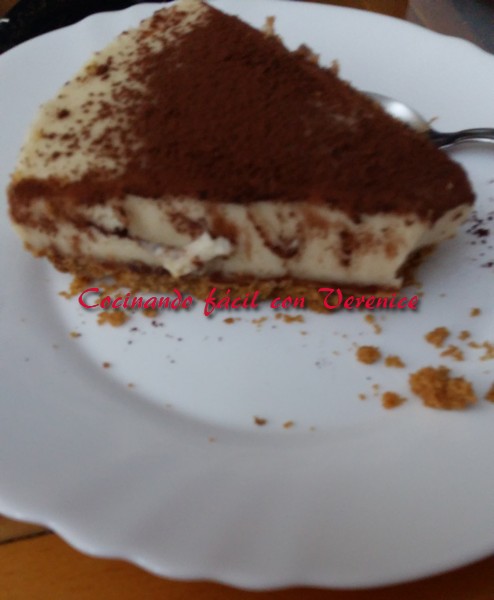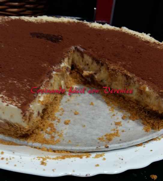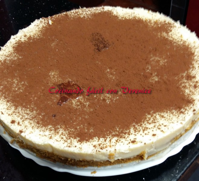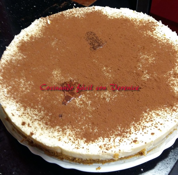 Sacamos el molde del frigorífico y echamos la mezcla sobre la base de galletas.